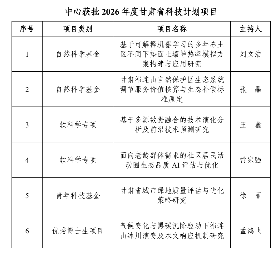 近日,甘肃省科学技术厅正式公布了2026年度省级科技计划拟立项项目名单,西北研究院文献情报中心共有6个项目获批立项。其中包括自然科学基金2项,软科学专项2项,青年科技基金1项,优秀博士生项目1项。涵盖多个前沿研究领域,展现了中心在生态环境、人工智能、气候变化等方向上的科研基础。