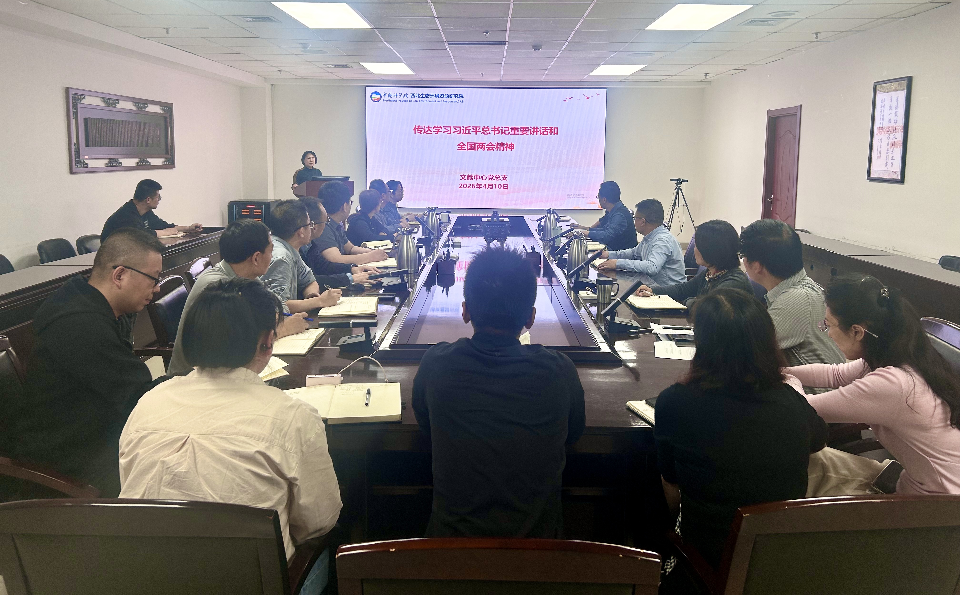 4月10日,中国科学院西北生态环境资源研究院文献中心党总支召开专题会议,传达学习习近平总书记在2026年全国两会期间重要讲话和全国两会精神。会议由党总支书记刘蔚主持。
