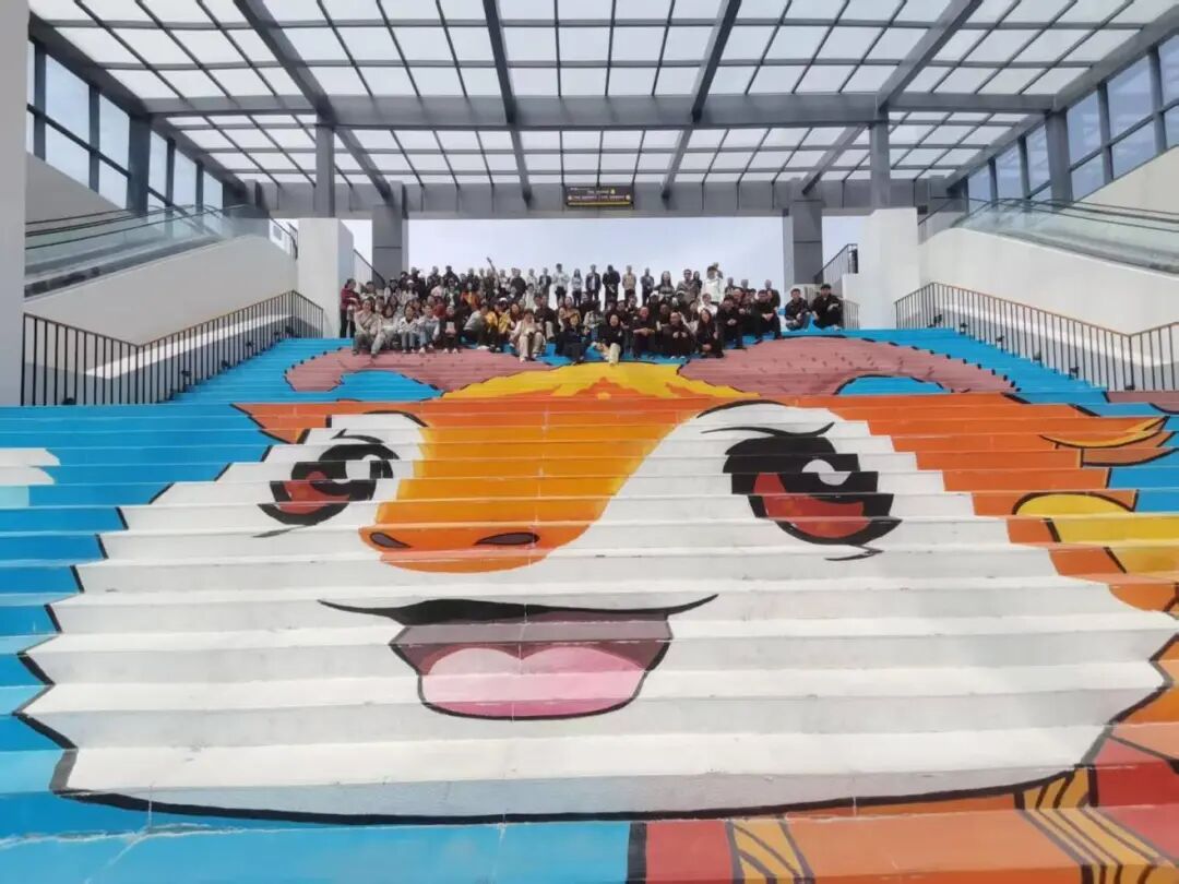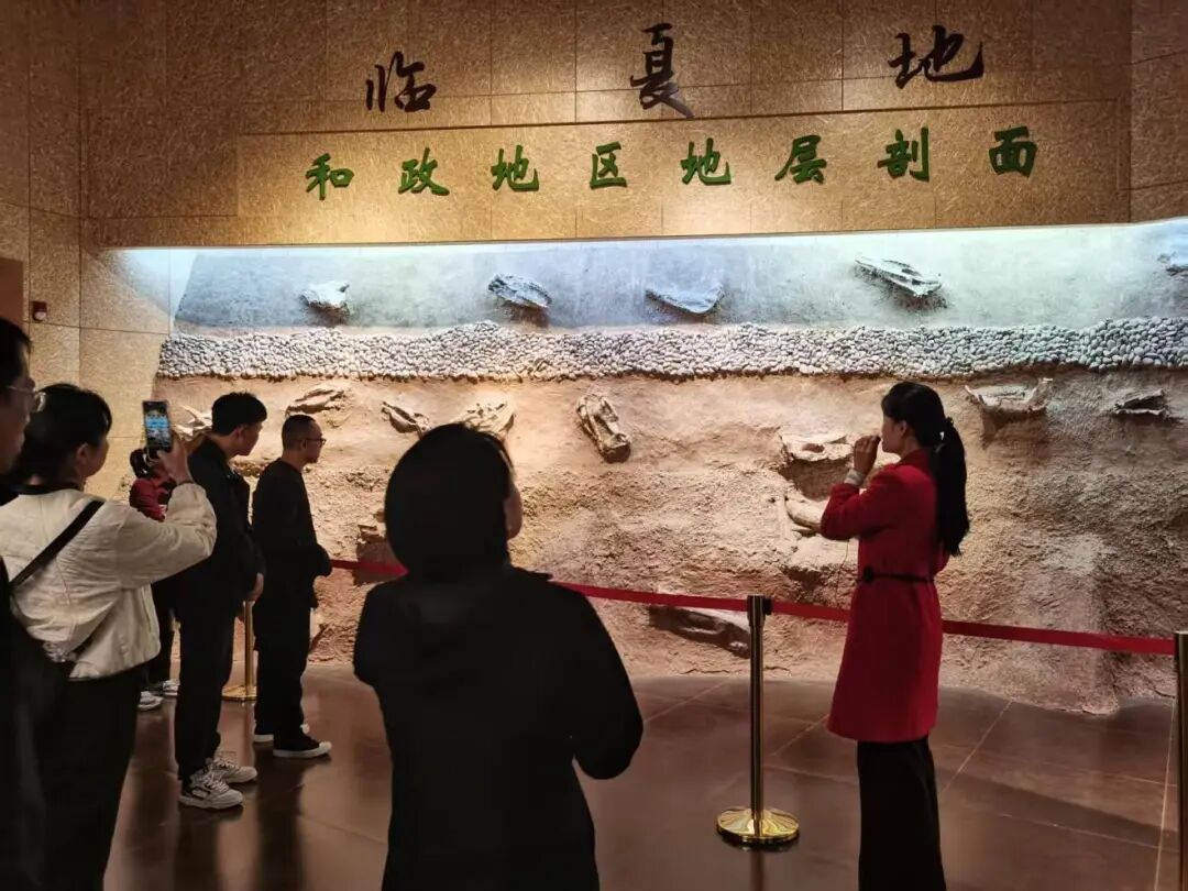 在和政古动物化石博物馆,党员们通过实地观摩、聆听讲解,深入了解地球演化、生物进化与气候环境变迁规律,实现了党建活动与科研视野拓展的有机融合。活动当天正值“世界阅读日”,博物馆特意为参观团队赠送主题科普读物,丰富了“阅读+实践”相结合的学习形式。参观结束后,台阶上彩绘的“和政羊”图案吸引了全体党员的目光,大家自发组织“与微笑合影”互动环节,以温暖活泼的形式传递积极向上的正能量。