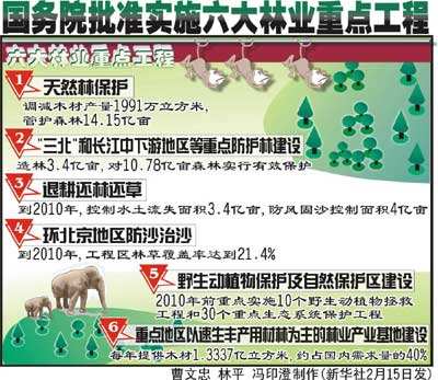 以江泽民同志为核心的第三代领导人,发出了“全党动员、全民动手、植树造林、绿化祖国”的号召,2001年开始实施天然林资源保护、退耕还林、京津风沙源治理等六大林业重点工程。