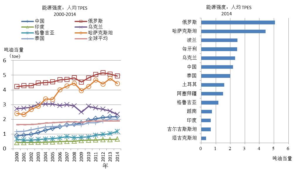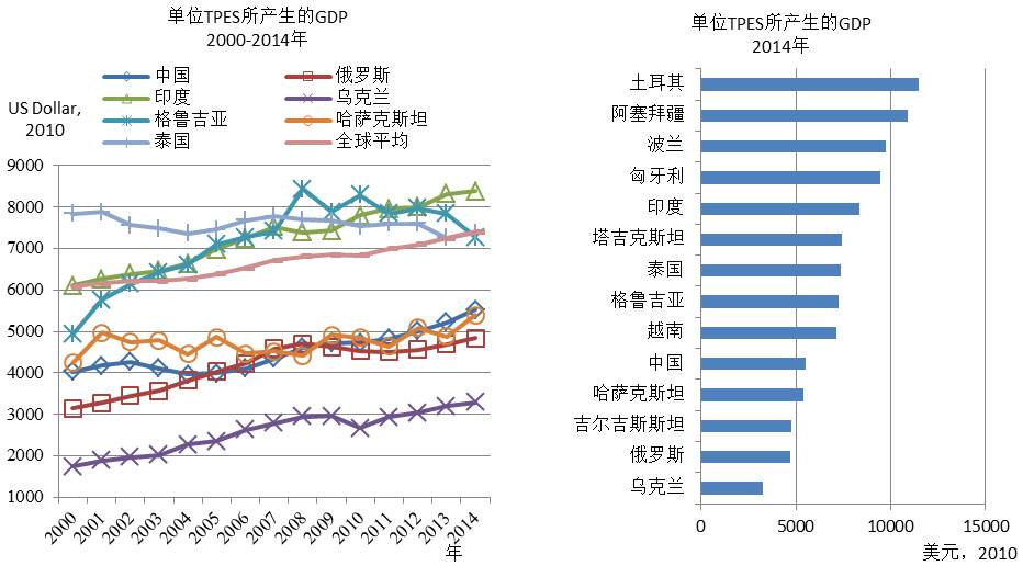 能源生产率是指在一定时间内投入系统的能源要素与该系统所创造的附加价值的比率。能源生产率可用来衡量能源消耗利用效率。能源生产率方面,选用每单位总初级能源生产供给(TPES)所产生的GDP 与人均TPES两个指标进行分析。2000-2014年期间,“一带一路”沿线国家的能源生产率有了很大的提升,每单位TPES所产生的GDP(美元,2010)中,欧洲国家土耳其、阿塞拜疆、波兰、匈牙利等国家提升最高,俄罗斯与部分中亚国家较低。