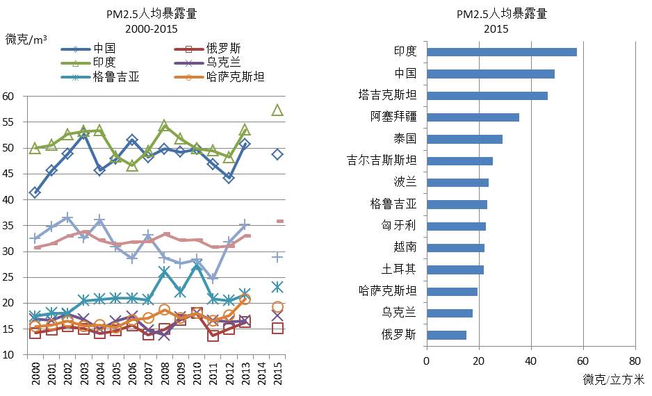 图8 2000-2015年部分国家PM2.5平均人口暴露度情况