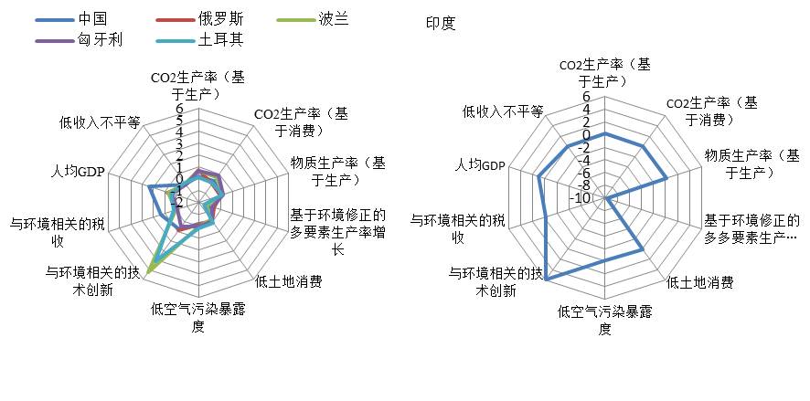 由于数据获得性的限制,本报告分两组对所选国家2000-2015年的绿色发展进行总体评价。利用10个维度指标的评价中,该组6个国家中,波兰、土耳其与中国的绿色进展最大,印度在同期取得的进展最小(图17)。利用5个维度指标评价的7个国家中(图18),哈萨克斯坦、阿塞拜疆等国家同期的绿色发展进展最大,越南最小。