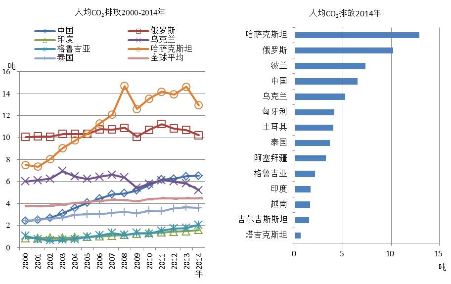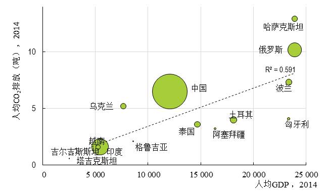 图15 部分“一带一路”国家人均GDP与人均CO2排放(2014)