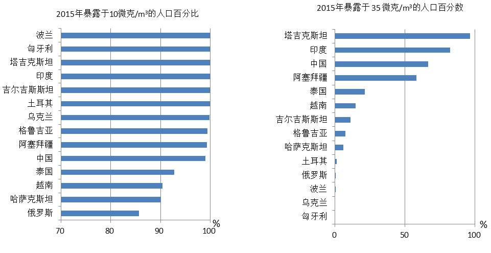 图9 2015年部分国家暴露于10微克/m3与35微克/m3PM2.5的人口百分数