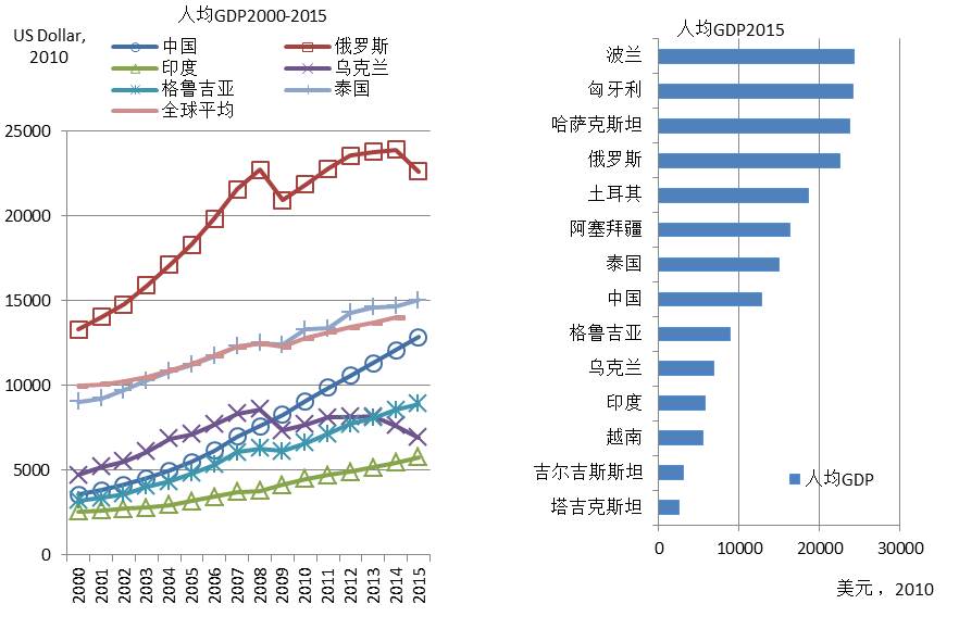 2000-2015年,“一带一路”沿线国家及地区人均GDP保持不断增长势头,其中所选国家中,俄罗斯、哈萨克斯坦、泰国的人均GDP高于全球平均水平。波兰、匈牙利等欧洲国家在2015年的人均GDP为最高,印度、越南、塔吉克斯坦、吉尔吉斯斯坦等东南亚、南亚及中亚部分国家2015年的人均GDP为所选国家中最低(图1)。