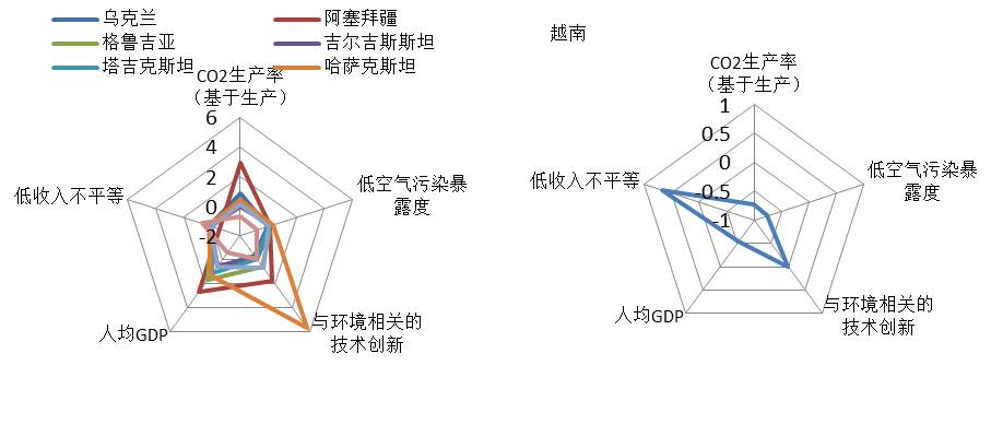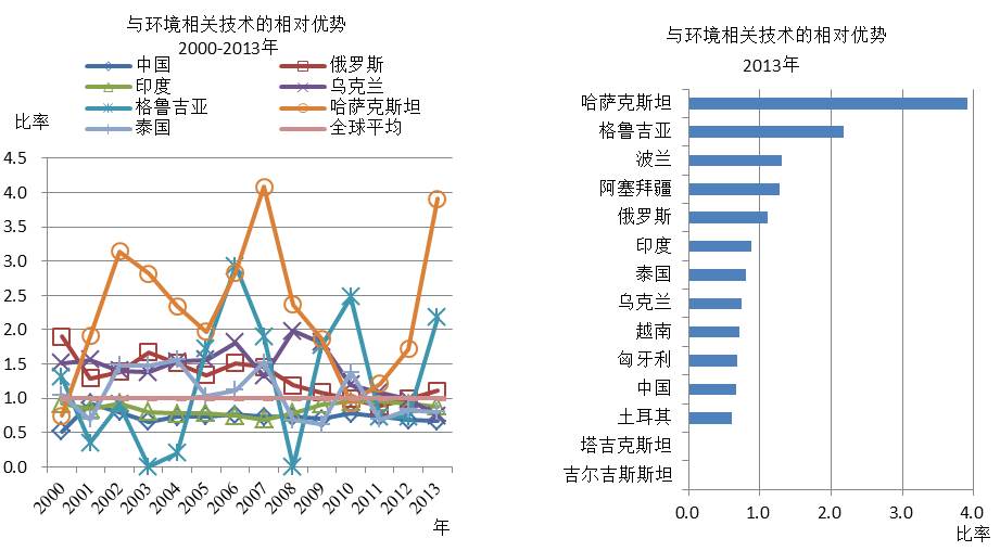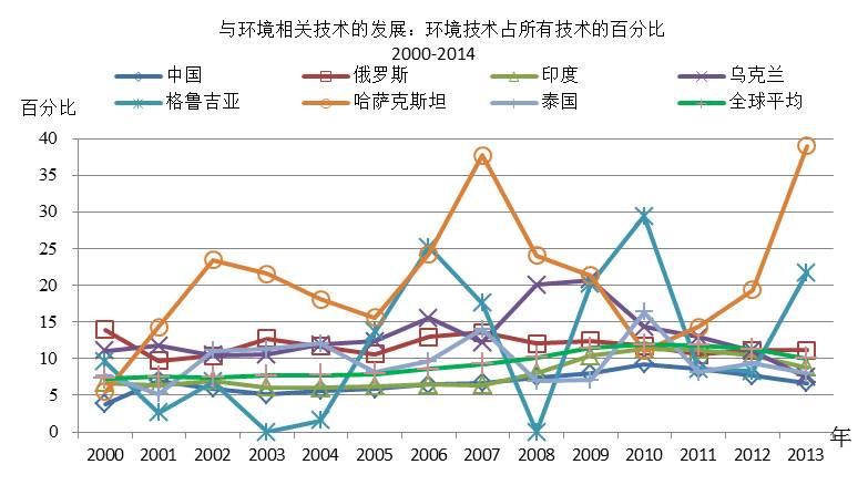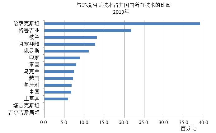 与环境相关技术的发展中,中国与印度的技术在不断加大。在一些国家如吉尔吉斯斯坦、塔吉克斯坦、格鲁吉亚、阿塞拜疆等国家,其对全球环境相关技术的贡献几为空白。