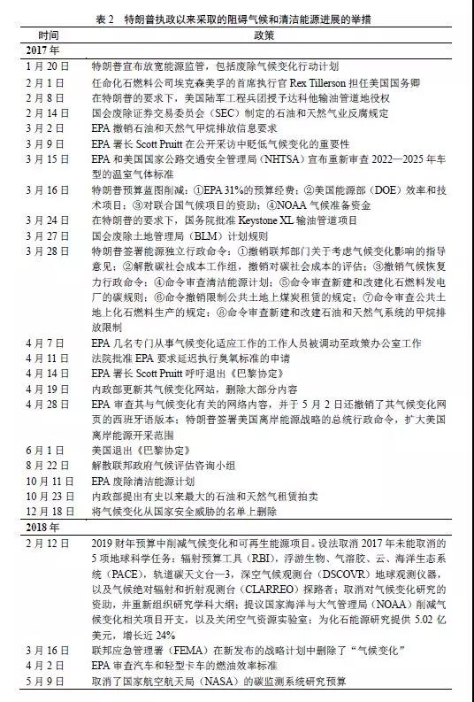 特朗普上台后扭转了奥巴马政府对于气候变化问题的积极政策,从废除清洁能源计划、退出《巴黎协定》、回归传统能源政策、削减气候预算、多渠道降低气候的重要性等方面的措施,导致美国气候政策的全面倒退(表2)。