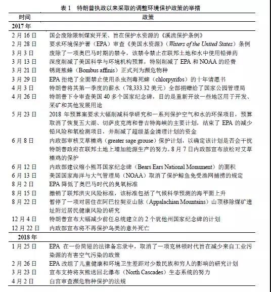 特朗普上台以后,通过多种措施手段,废除或调整多项环保监管法规,包括水资源、土壤、空气污染的保护条例,以及一些物种保护条例,以使一些地方的环境保护让位于经济开发活动。表1列举了特朗普执政以来采取的调整环境保护政策的举措。